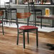 This chair's sturdy steel frame provides unmatched durability in your commercial dining room. It can hold up to 330 lb. of weight thanks to the steel frame and supports under the seat. Additionally, the black finish on this chair ensures longevity through everyday wear and tear, resisting stains, scratches, and smudges. It also features an attractive vintage wood back that's contoured to provide extra support to your customers' upper backs. The 2 1/2" thick burgundy vinyl padded seat brings exceptional comfort and durability while remaining easy to clean. It is made with fire-retardant foam for ultimate safety!