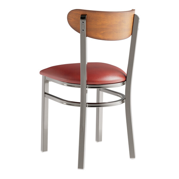 Seat your guests in comfort and style with this Lancaster Table & Seating Boomerang clear coat finish chair with 2 1/2" burgundy vinyl padded seat and antique walnut wood back.
