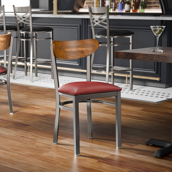 Seat your guests in comfort and style with this Lancaster Table & Seating Boomerang clear coat finish chair with 2 1/2" burgundy vinyl padded seat and vintage wood back.