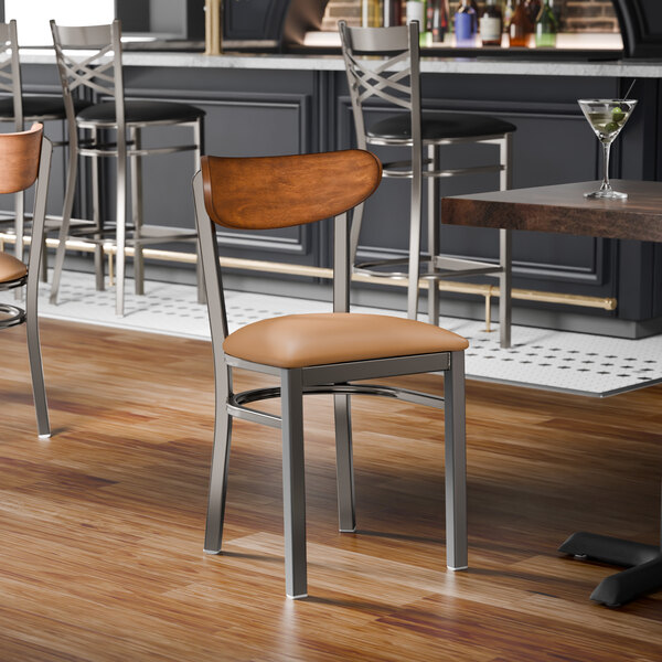 Seat your guests in comfort and style with this Lancaster Table & Seating Boomerang clear coat finish chair with 2 1/2" light brown vinyl padded seat and antique walnut wood back.