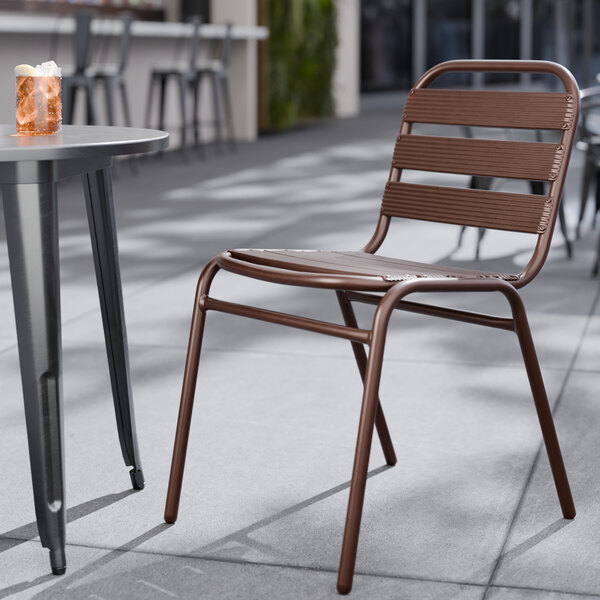 Allow your guests to enjoy the breezy summer weather with this Lancaster Table & Seating bronze outdoor side chair.