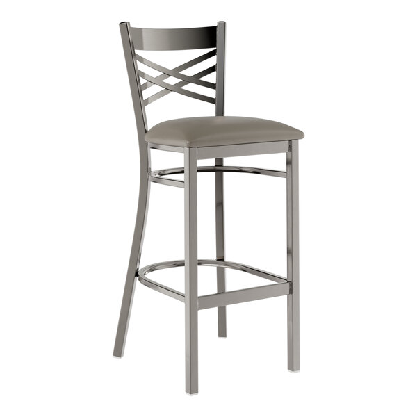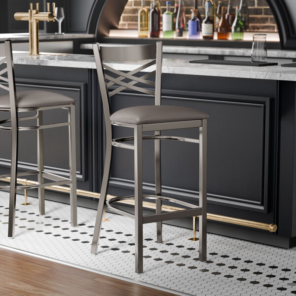 This bar stool's sleek padded seat combines with its contemporary cross back steel frame to instill a modern look in any location. Plus, since this bar stool's back is contoured for a customer's back, it will provide comfort while maintaining a distinct appearance.