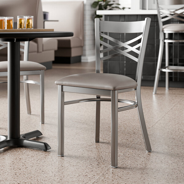 This chair's sleek padded seat combines with its contemporary cross back steel frame to instill a modern look in any location. Plus, since this chair's back is contoured for a customer's back, it will provide comfort while maintaining a distinct appearance.