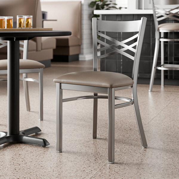 Seat your guests in comfort and style with this Lancaster Table & Seating clear coat finish cross back chair with 2 1/2" taupe vinyl padded seat.