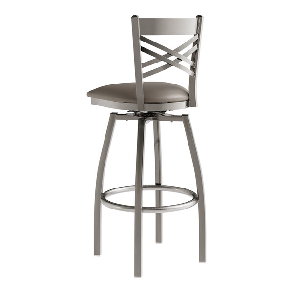 Seat your guests in comfort and style with this Lancaster Table & Seating clear coat finish cross back swivel bar stool with 2 1/2" dark gray vinyl padded seat.