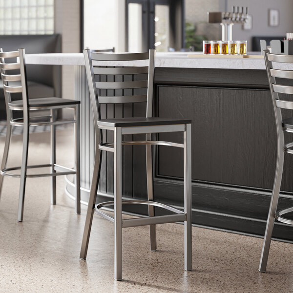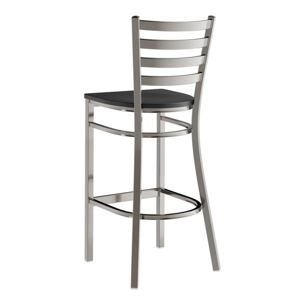 This bar stool's sturdy wood seat with a sleek black finish combines with its contemporary ladder back steel frame to instill a modern look in any location. Plus, since this bar stool's back is contoured for a customer's back, it will provide comfort while maintaining a distinct appearance.
