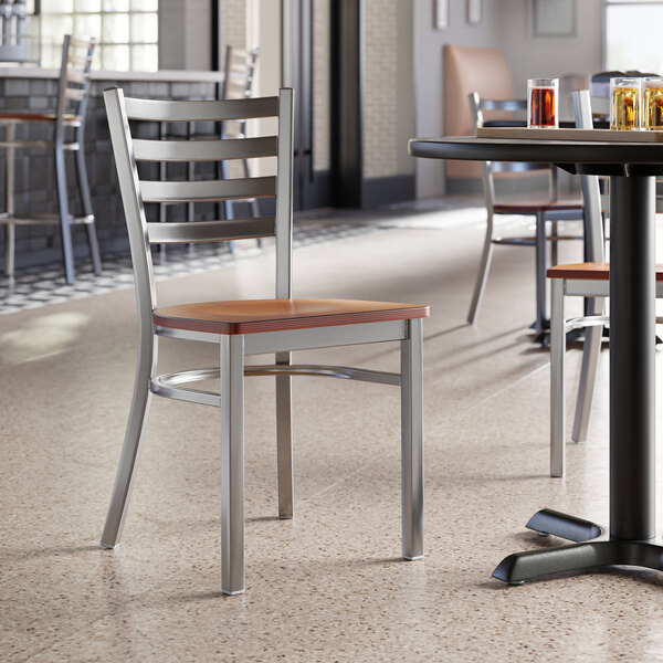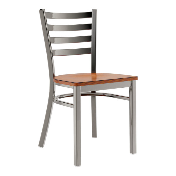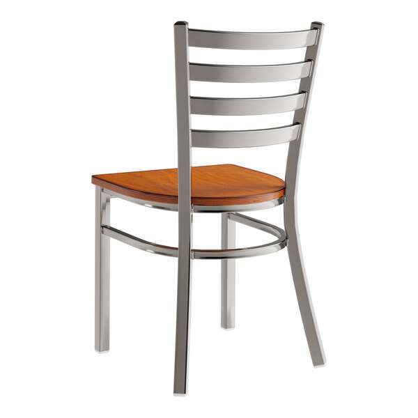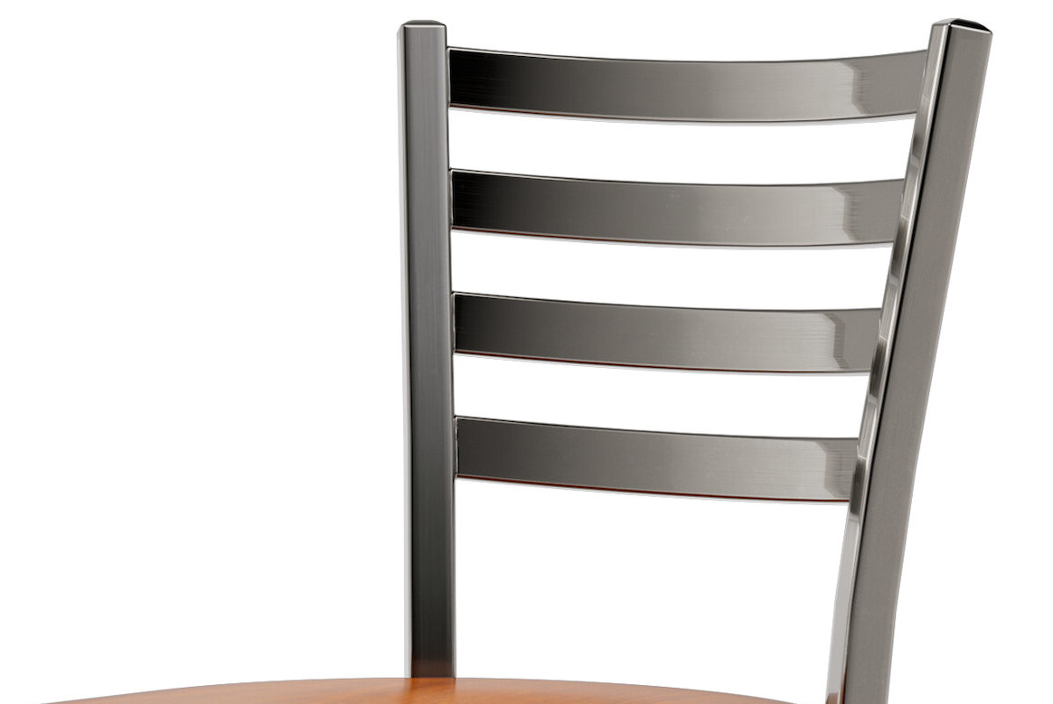 This chair's sleek wood seat combines with its contemporary ladder back steel frame to instill a modern look in any location. Plus, since this chair's back is contoured for a customer's back, it will provide comfort while maintaining a distinct appearance.