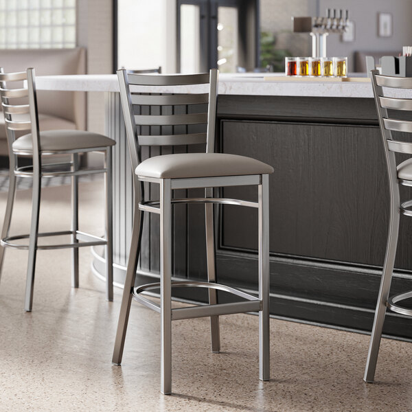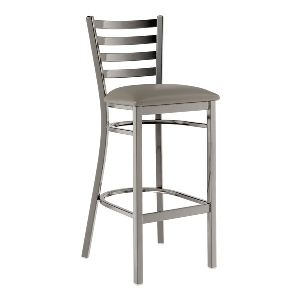 Seat your guests in comfort and style with this Lancaster Table & Seating clear coat finish ladder back bar stool with 2 1/2" dark gray vinyl padded seat.