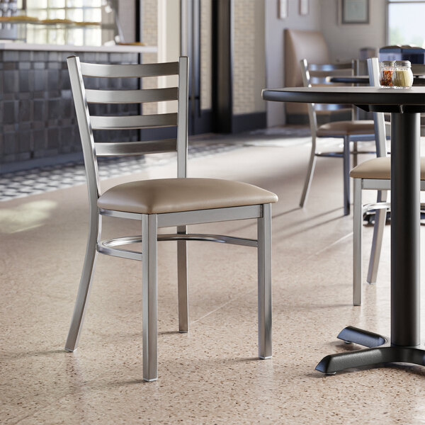 Seat your guests in comfort and style with this Lancaster Table & Seating clear coat finish ladder back chair with 2 1/2" taupe vinyl padded seat.