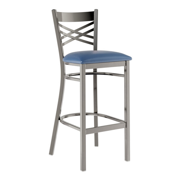 Seat your guests in comfort and style with this Lancaster Table & Seating clear coat finish cross back bar stool with 2 1/2" navy vinyl padded seat.