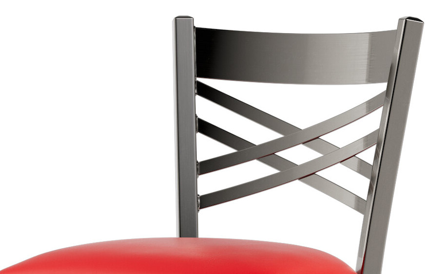 This bar stool's sleek padded seat combines with its contemporary cross back steel frame to instill a modern look in any location. Plus, since this bar stool's back is contoured for a customer's back, it will provide comfort while maintaining a distinct appearance.