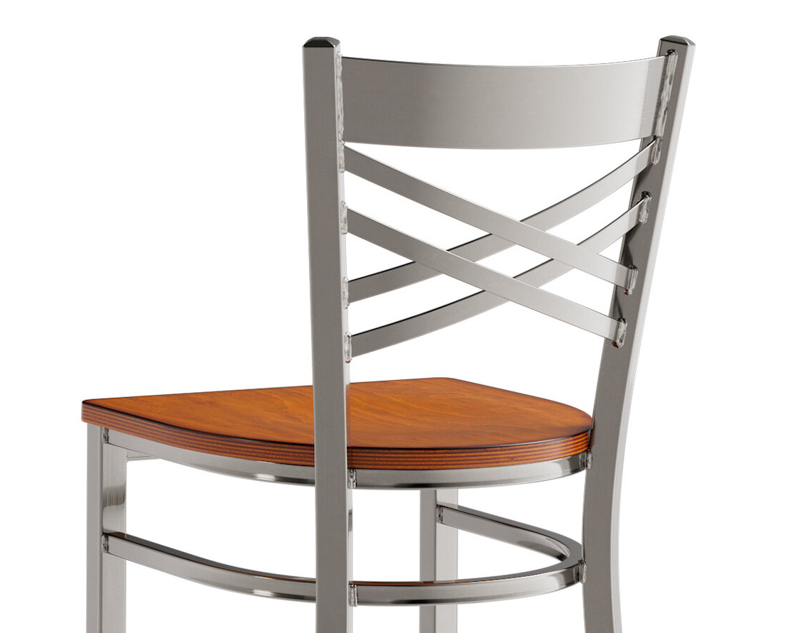 This bar stool's sturdy wood seat with a sleek antique walnut finish combines with its contemporary cross back steel frame to instill a modern look in any location. Plus, since this bar stool's back is contoured for a customer's back, it will provide comfort while maintaining a distinct appearance.