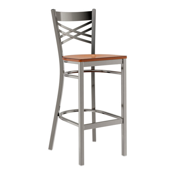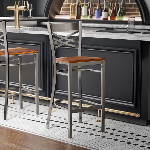 Seat your guests in comfort and style with this Lancaster Table & Seating clear coat finish cross back bar stool with antique walnut wood seat.