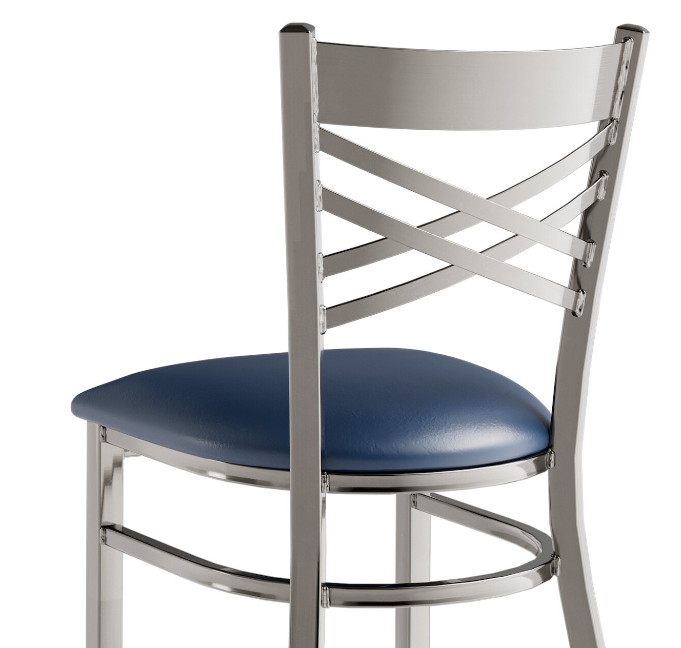 This chair's sleek padded seat combines with its contemporary cross back steel frame to instill a modern look in any location. Plus, since this chair's back is contoured for a customer's back, it will provide comfort while maintaining a distinct appearance.