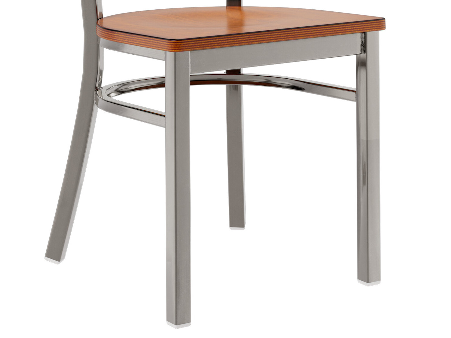 This chair's sleek wood seat combines with its contemporary cross back steel frame to instill a modern look in any location. Plus, since this chair's back is contoured for a customer's back, it will provide comfort while maintaining a distinct appearance.