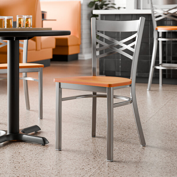 This chair's sleek wood seat combines with its contemporary cross back steel frame to instill a modern look in any location. Plus, since this chair's back is contoured for a customer's back, it will provide comfort while maintaining a distinct appearance.