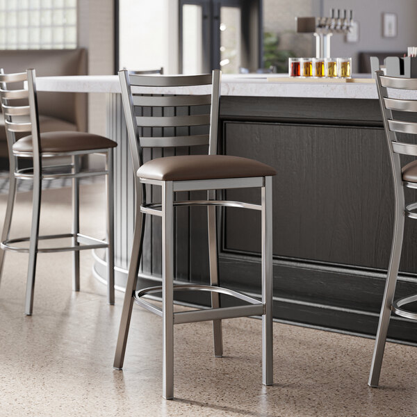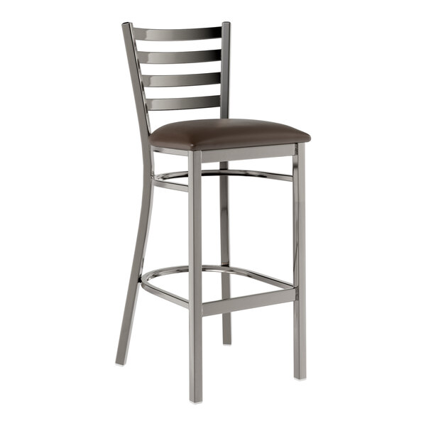 Seat your guests in comfort and style with this Lancaster Table & Seating clear coat finish ladder back bar stool with 2 1/2" dark brown vinyl padded seat.