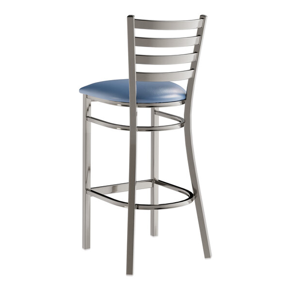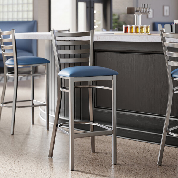 Seat your guests in comfort and style with this Lancaster Table & Seating clear coat finish ladder back bar stool with 2 1/2" navy blue vinyl padded seat.