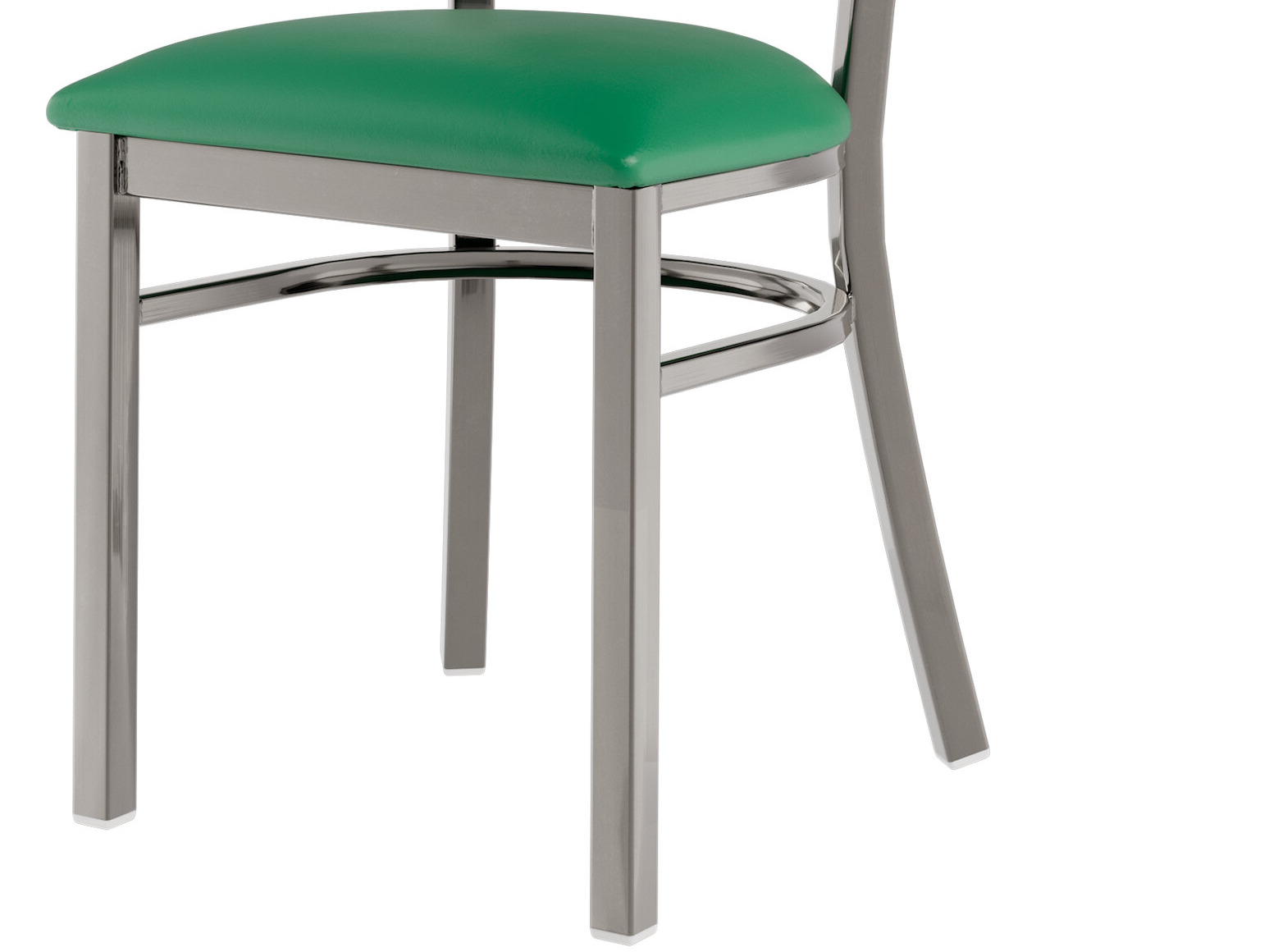 The 2 1/2" thick green vinyl padded seat provides exceptional comfort for your guests, and it's also durable and easy to clean! It is made with fire-retardant foam for added safety.