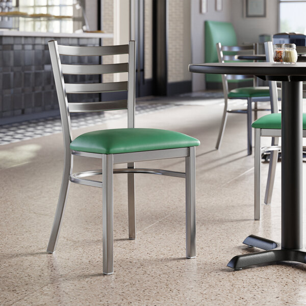 Seat your guests in comfort and style with this Lancaster Table & Seating clear coat finish ladder back chair with 2 1/2" green vinyl padded seat.