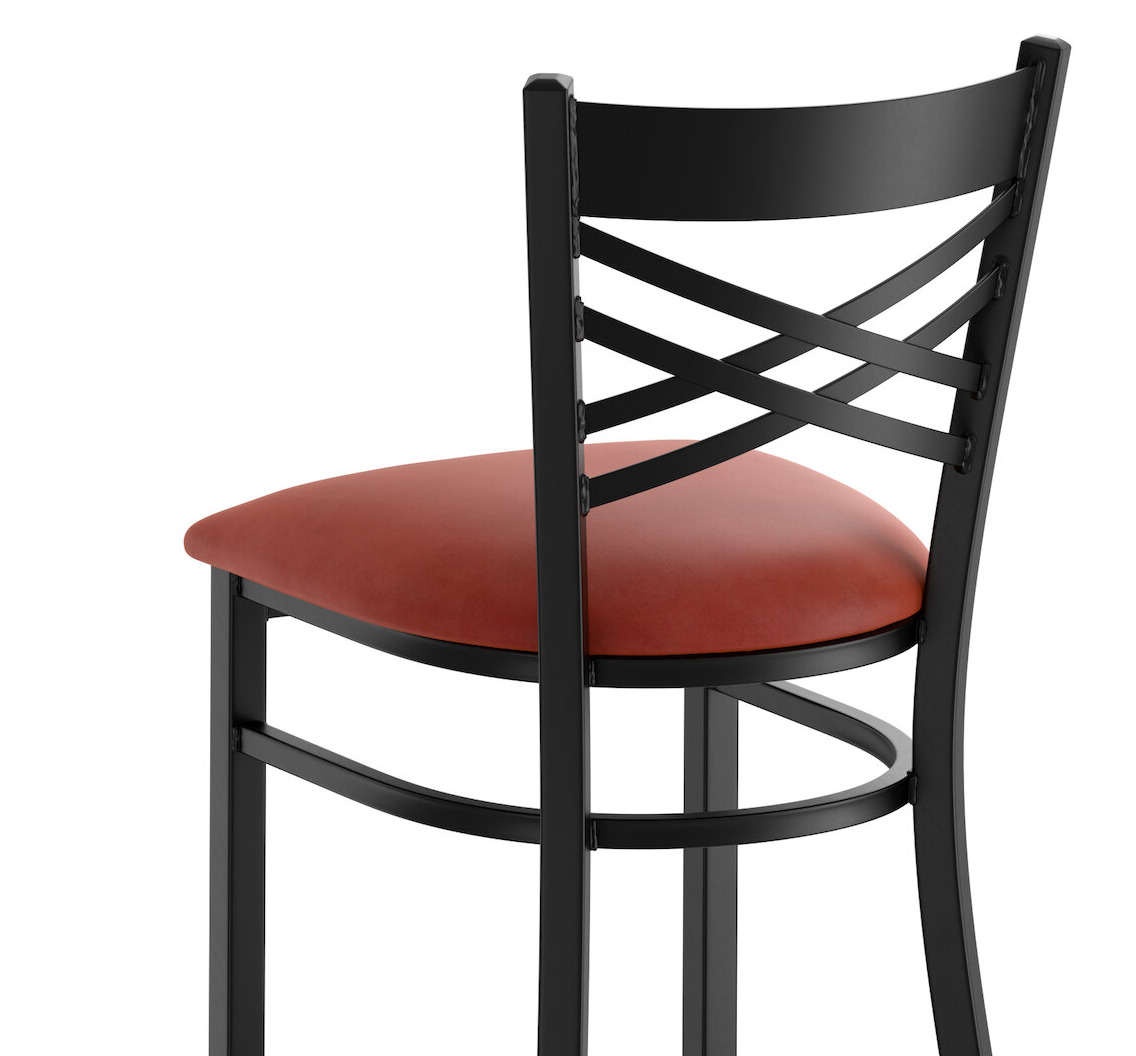 This bar stool's sleek padded seat combines with its contemporary cross back steel frame to instill a modern look in any location. Plus, since this bar stool's back is contoured for a customer's back, it will provide comfort while maintaining a distinct appearance.