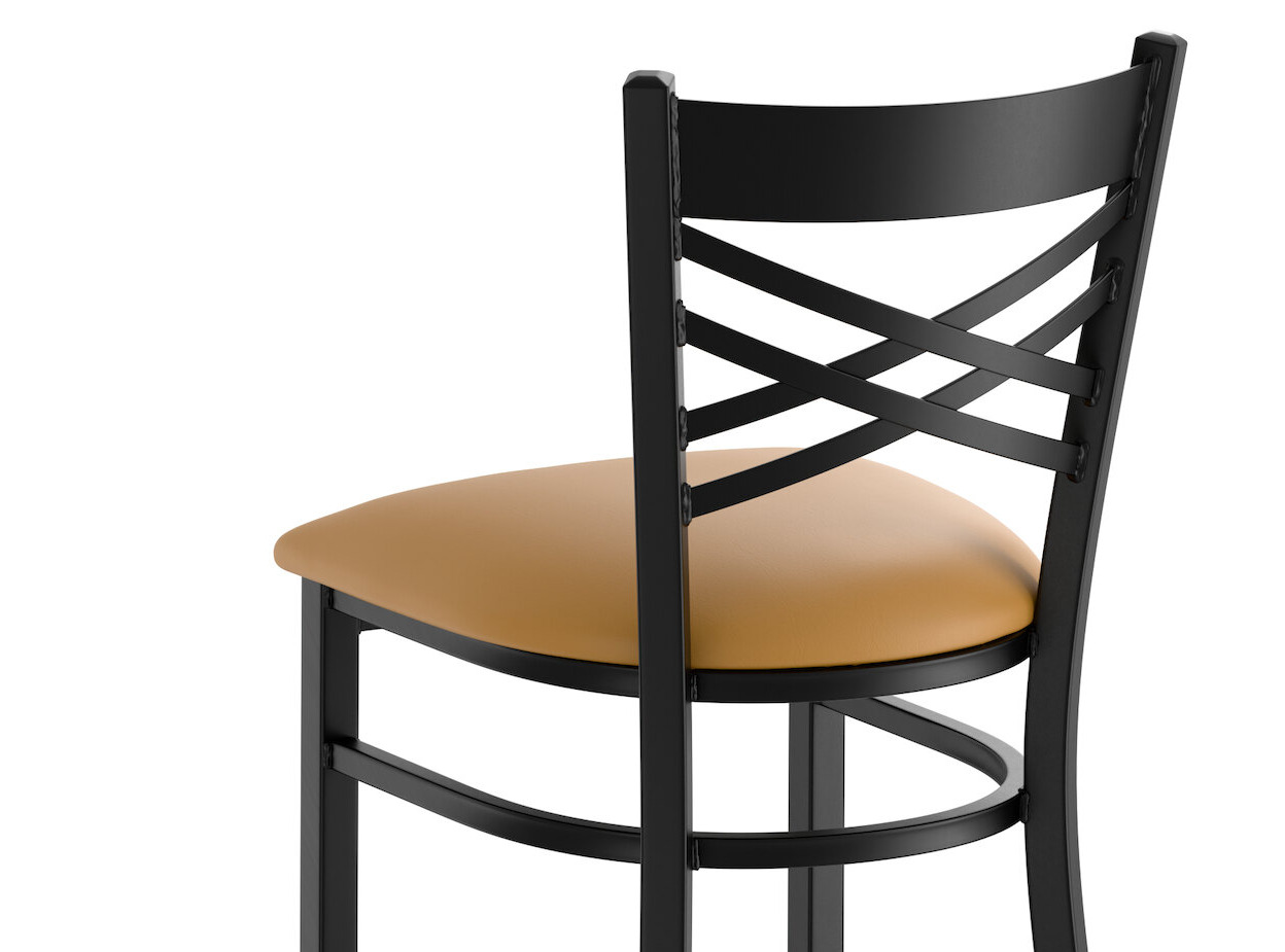 Seat your guests in comfort and style with this Lancaster Table & Seating black finish cross back bar stool with 2 1/2" light brown vinyl padded seat.