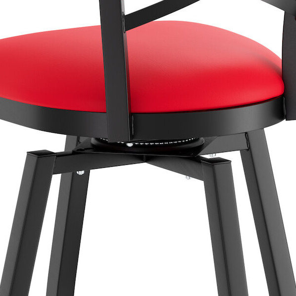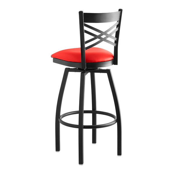 Seat your guests in comfort and style with this Lancaster Table & Seating black finish cross back swivel bar stool with 2 1/2" red vinyl padded seat.