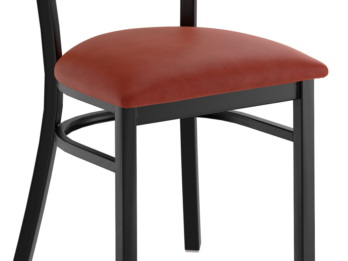 The 2 1/2" thick burgundy vinyl padded seat provides exceptional comfort for your guests, and it's also durable and easy to clean! It is made with fire-retardant foam for added safety.