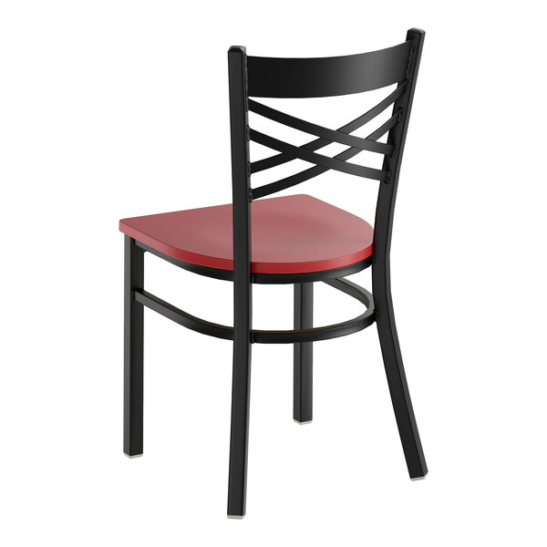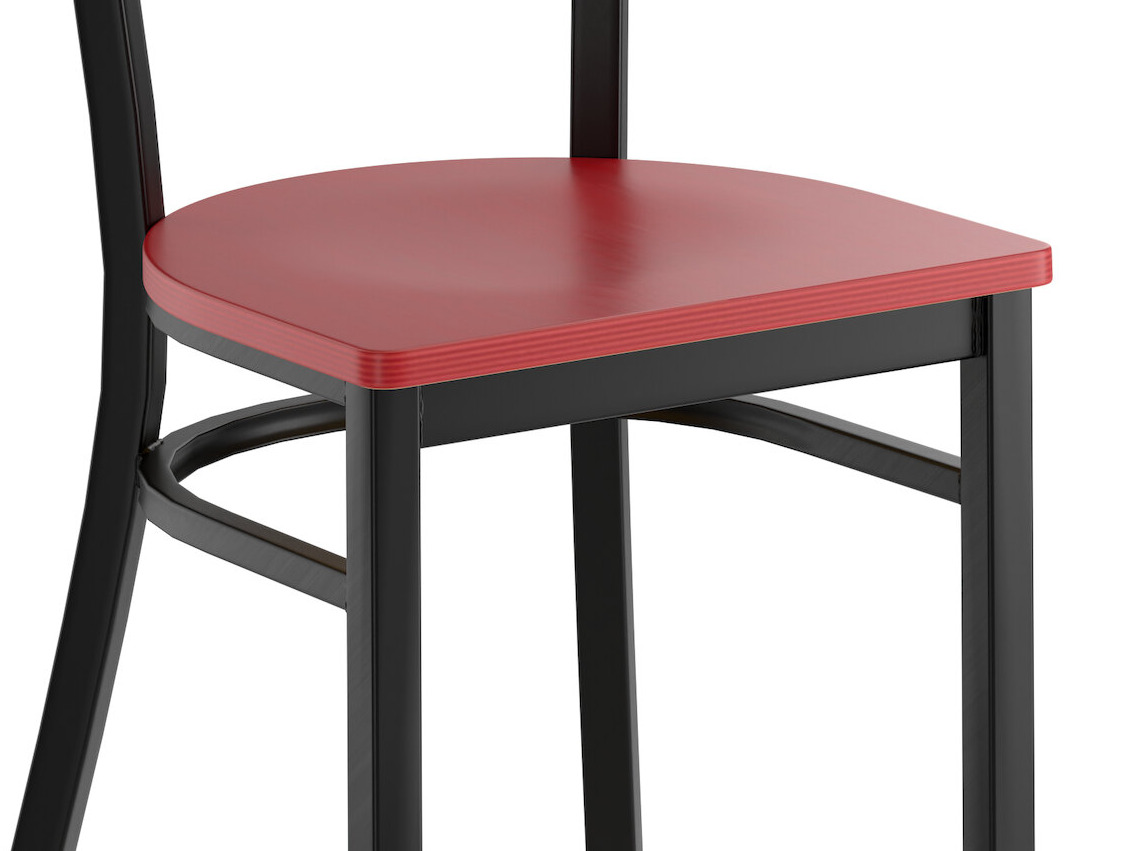 This chair's sleek wood seat combines with its contemporary cross back steel frame to instill a modern look in any location. Plus, since this chair's back is contoured for a customer's back, it will provide comfort while maintaining a distinct appearance.