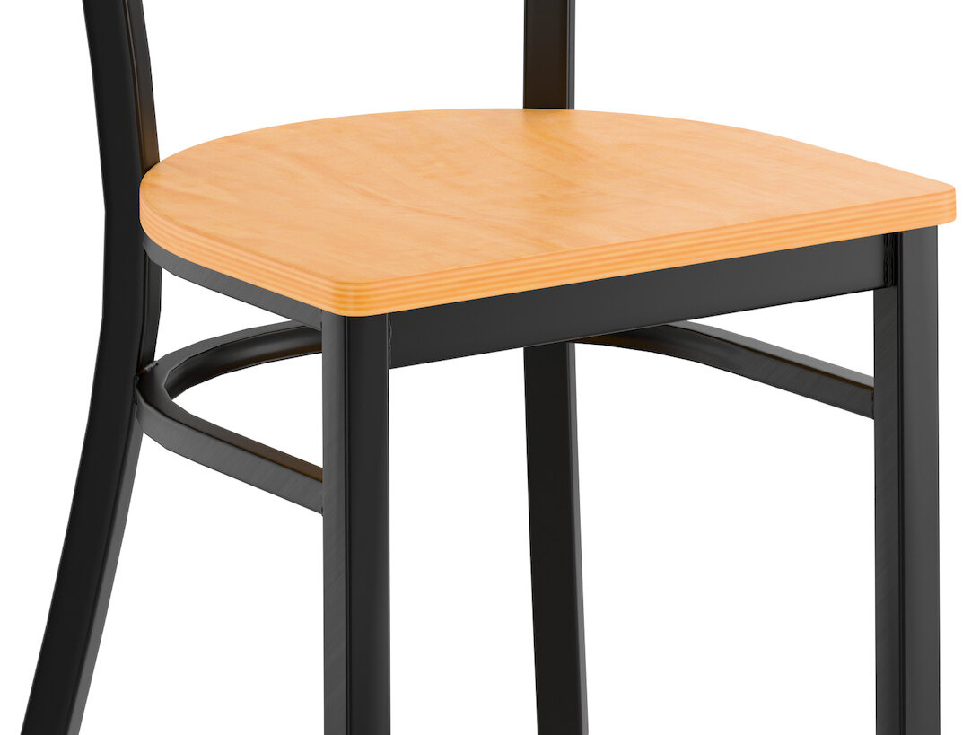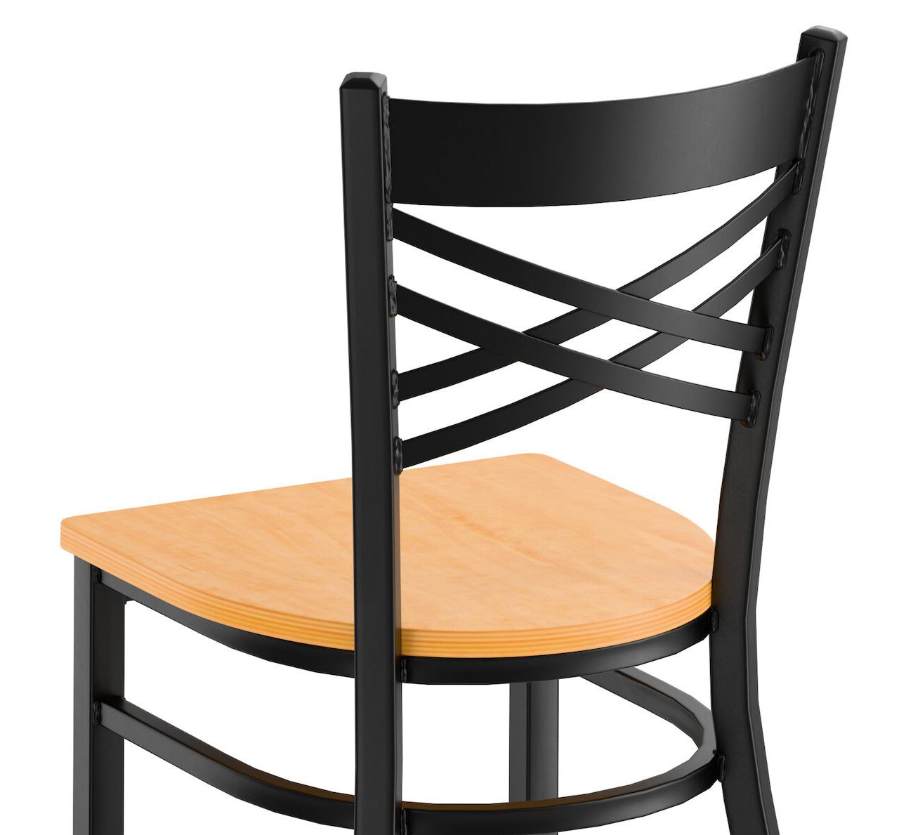 This chair's sleek wood seat combines with its contemporary cross back steel frame to instill a modern look in any location. Plus, since this chair's back is contoured for a customer's back, it will provide comfort while maintaining a distinct appearance.