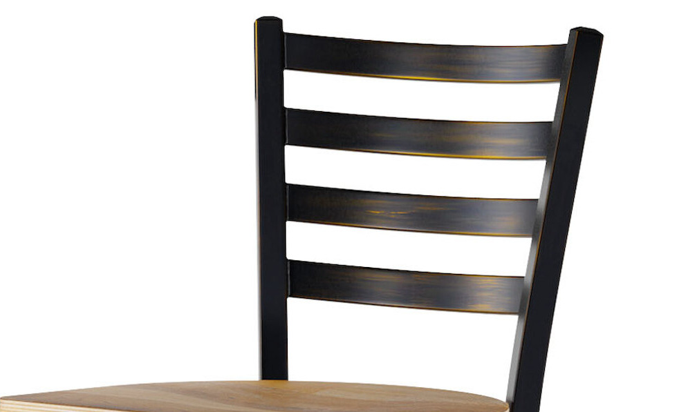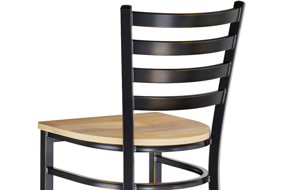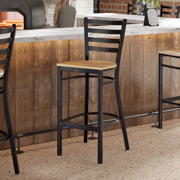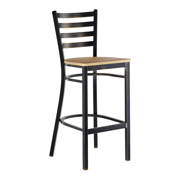 This bar stool's sturdy wood seat with a sleek driftwood finish combines with its contemporary ladder back steel frame to instill a modern look in any location. Plus, since this bar stool's back is contoured for a customer's back, it will provide comfort while maintaining a distinct appearance.