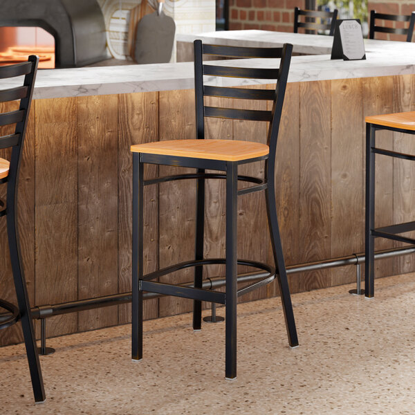 This bar stool's sturdy wood seat with a sleek natural finish combines with its contemporary ladder back steel frame to instill a modern look in any location. Plus, since this bar stool's back is contoured for a customer's back, it will provide comfort while maintaining a distinct appearance.