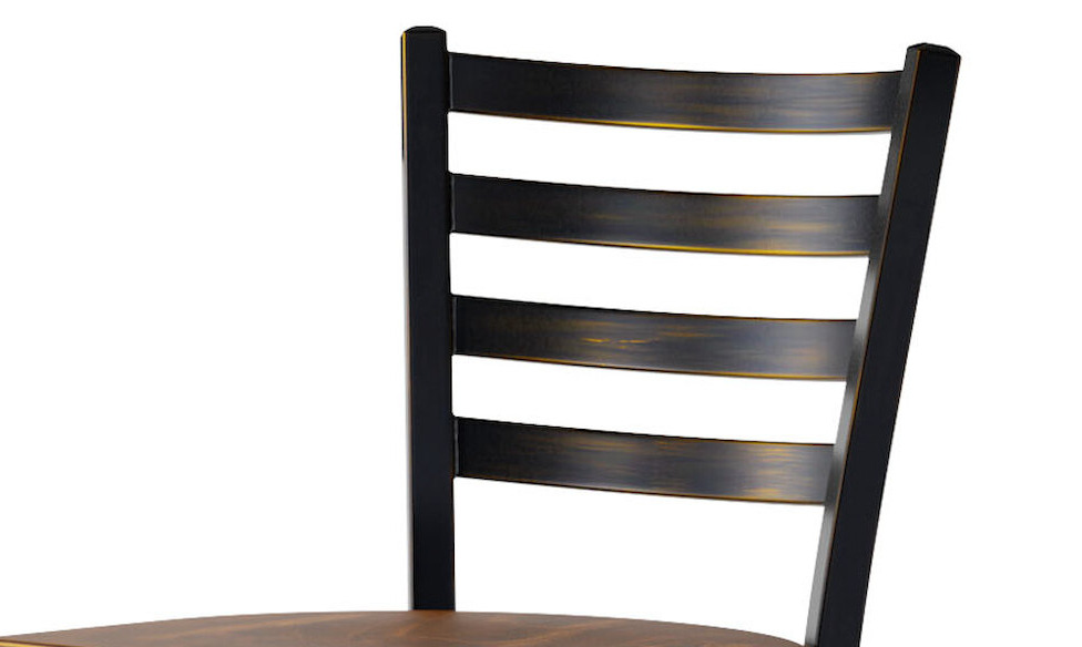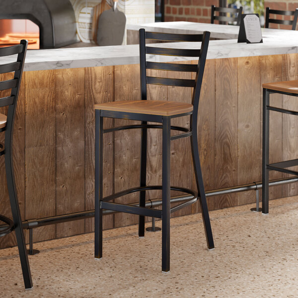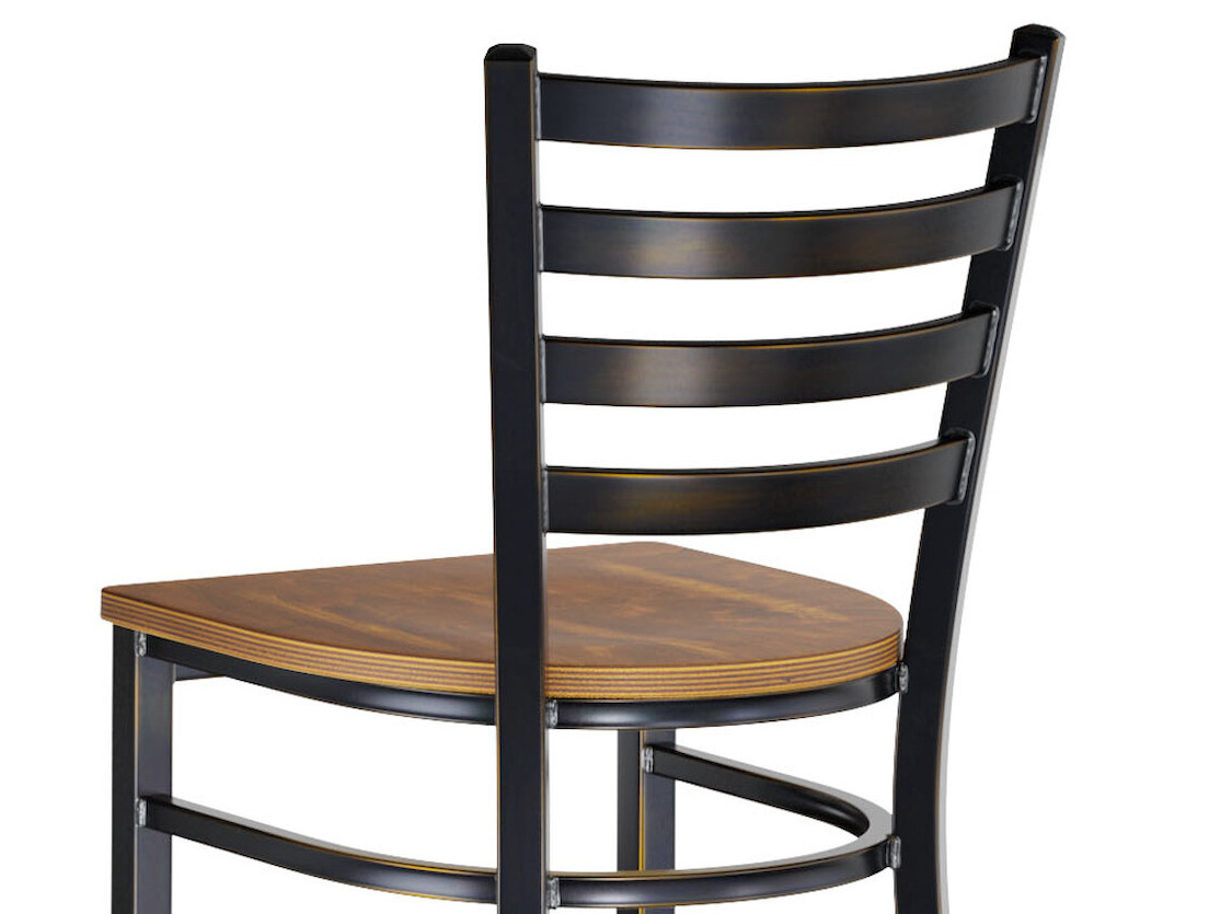 This bar stool's sturdy wood seat with a sleek vintage finish combines with its contemporary ladder back steel frame to instill a modern look in any location. Plus, since this bar stool's back is contoured for a customer's back, it will provide comfort while maintaining a distinct appearance.