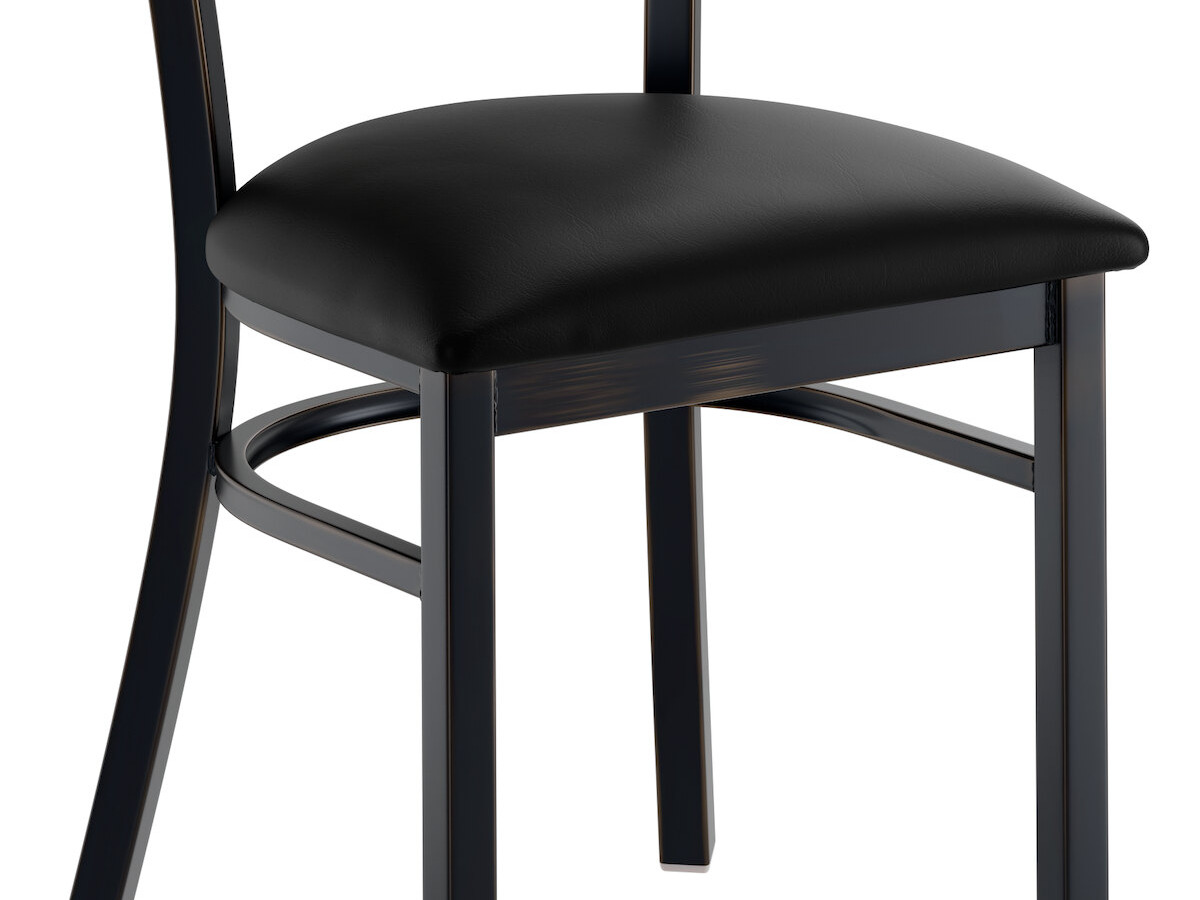 The 2 1/2" thick black vinyl padded seat provides exceptional comfort for your guests, and it's also durable and easy to clean! It is made with fire-retardant foam for added safety.