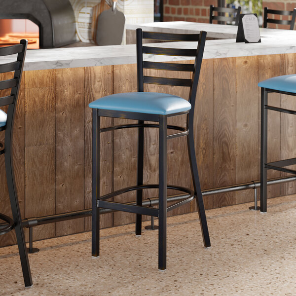 Seat your guests in comfort and style with this Lancaster Table & Seating distressed copper finish ladder back bar stool with 2 1/2" blue vinyl padded seat.