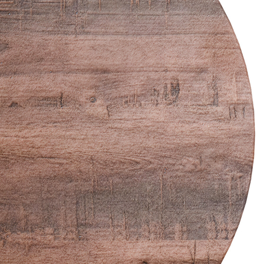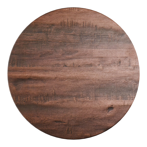 This round table top has a textured walnut finish that offers the rustic look of solid wood with a subtle, intriguing texture. Whether you're looking to revamp your restaurant's front-of-house space or enhance the appearance of your cafe patio or deck, this table top will spotlight the beauty of nature while focusing on an elegant dining experience in order to bring you the best of both worlds! This table top can be used with compatible Lancaster Table & Seating Excalibur table bases (sold separately). A screw length of 3/4" is recommended for installation (hardware sold separately).