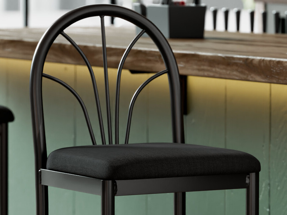 This bar stool features a spoke back design with slim, curved lines that start from a central point and radiate out, creating a unique fan shape that's both simple and stylish. The 1 3/4" thick black fabric padded seat provides exceptional comfort for your guests, and it's also durable and easy to clean! It is made with fire-retardant foam for added safety.