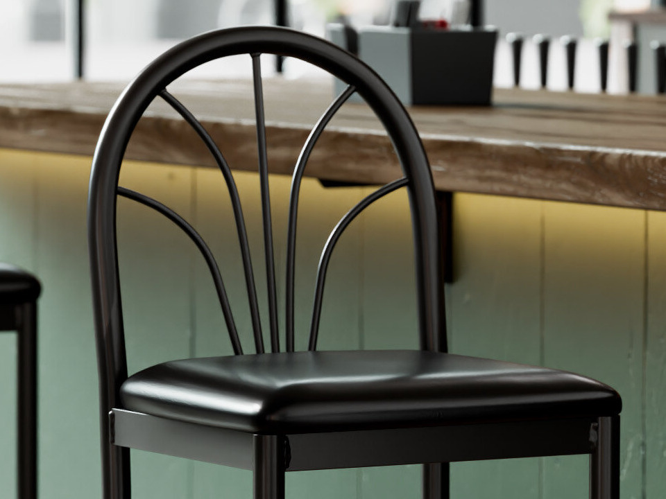 This bar stool features a spoke back design with slim, curved lines that start from a central point and radiate out, creating a unique fan shape that's both simple and stylish. The 1 3/4" thick black vinyl padded seat provides exceptional comfort for your guests, and it's also durable and easy to clean! It is made with fire-retardant foam for added safety.