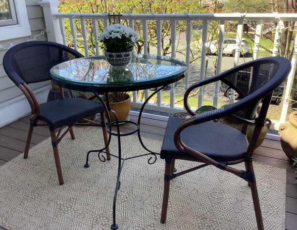 We use these Lancaster table and seating French bistro black and white outdoor chairs. Very durable and super light. We like that they are so light since we have to bring them in and out from our restaurant every day.