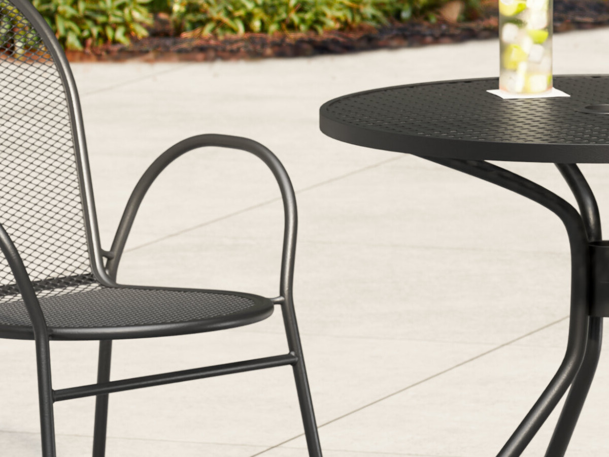This chair's mesh seat and full back provide superior comfort, and it ensures that water won't pool on the seat, helping it to dry faster after washing, accidental spills, or bad weather. To keep this chair looking clean, simply wipe it down with a damp cloth and your preferred mild soap. Pair this chair with a black Lancaster & Seating steel table (sold separately) for a complete dining set, or place it with a side table for a convenient seating option near your fire pit or outdoor bar.