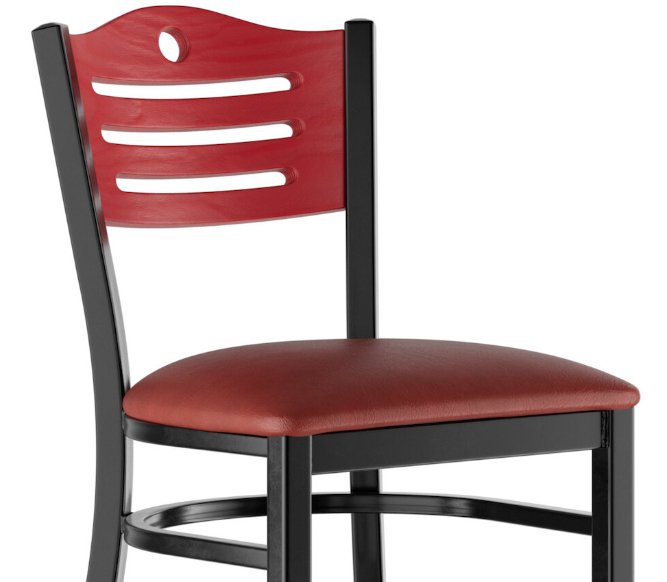 The 2 1/2" thick burgundy vinyl padded seat provides exceptional comfort for your guests, and it's also durable and easy to clean! It is made with fire-retardant foam for added safety.