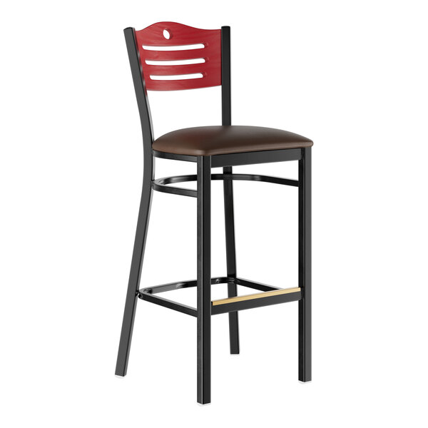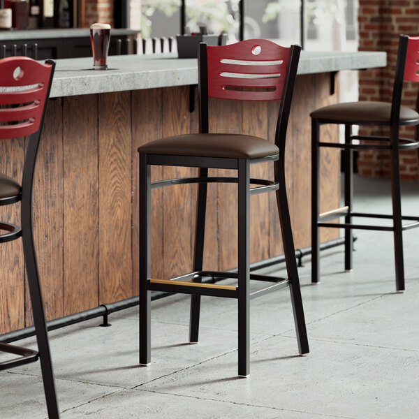 This bar stool's stylish back and padded seat combine with its modern steel frame to instill a unique look in any location. Plus, since this bar stool's back is contoured for a customer's back, it will provide comfort while maintaining a distinct appearance.