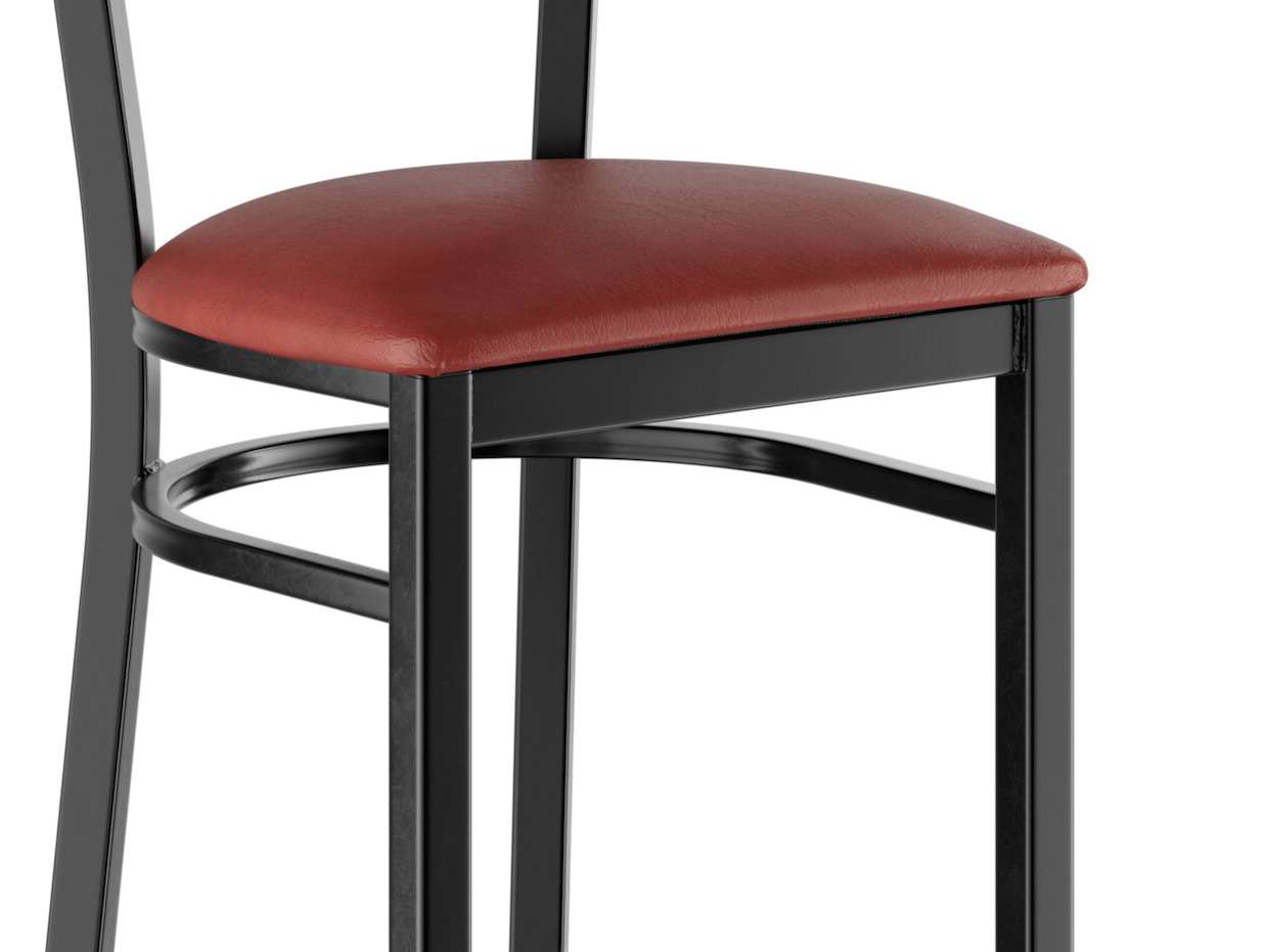The 2 1/2" thick burgundy vinyl padded seat provides exceptional comfort for your guests, and it's also durable and easy to clean! It is made with fire-retardant foam for added safety.