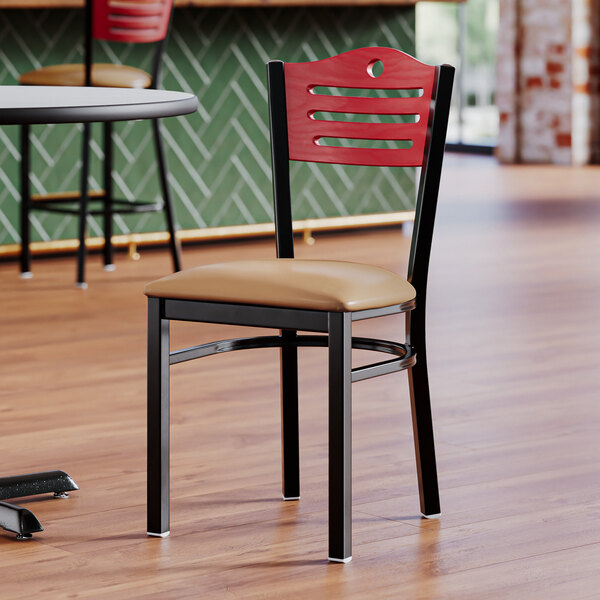 This chair's stylish back and padded seat combine with its modern steel frame to instill a unique look in any location. Plus, since this chair's back is contoured for a customer's back, it will provide comfort while maintaining a distinct appearance.