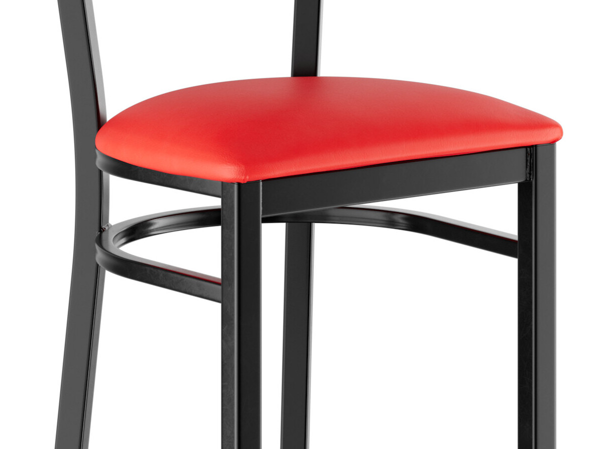 The 2 1/2" thick red vinyl padded seat provides exceptional comfort for your guests, and it's also durable and easy to clean! It is made with fire-retardant foam for added safety.