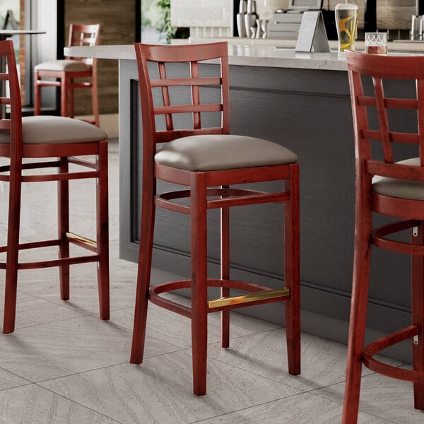 Seat your guests in comfort and style with this Lancaster Table & Seating mahogany finish wood window back bar stool with dark gray vinyl seat.