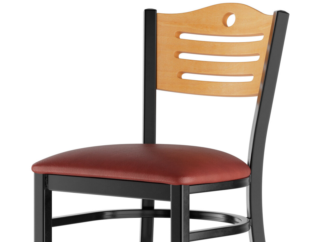 The 2 1/2" thick burgundy vinyl padded seat provides exceptional comfort for your guests, and it's also durable and easy to clean! It is made with fire-retardant foam for added safety.
