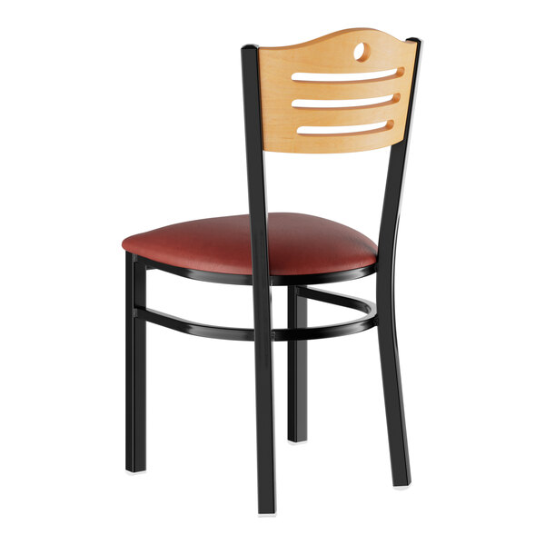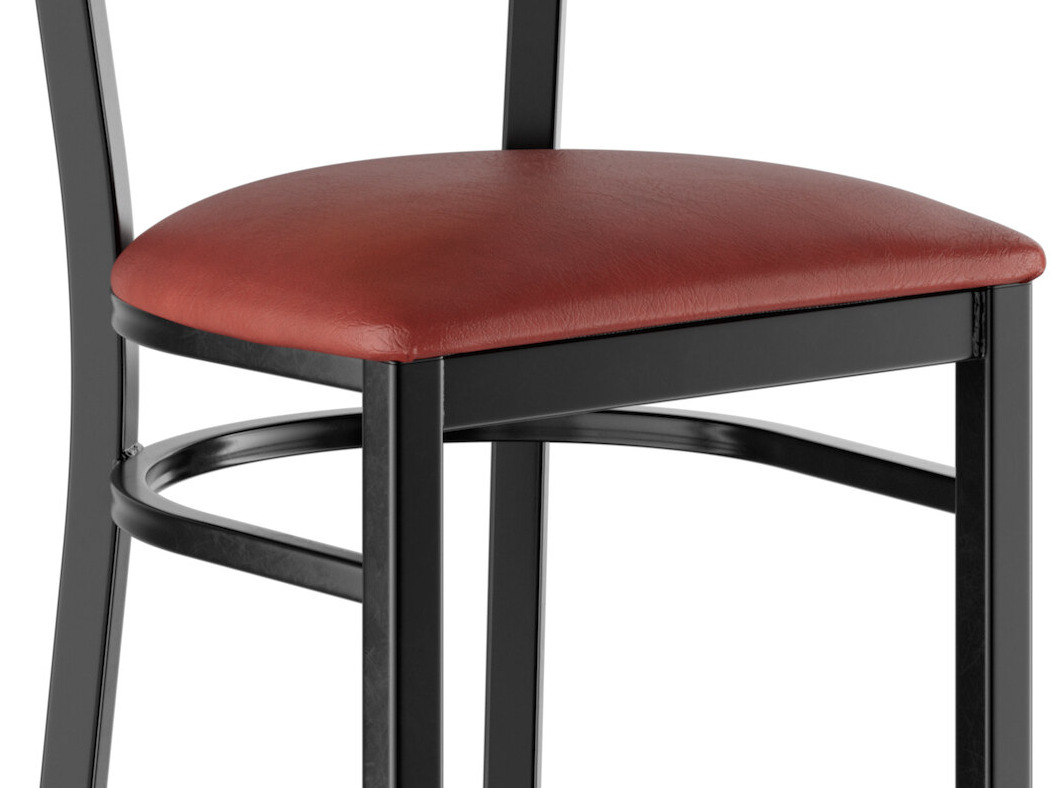 The 2 1/2" thick burgundy vinyl padded seat provides exceptional comfort for your guests, and it's also durable and easy to clean! It is made with fire-retardant foam for added safety.