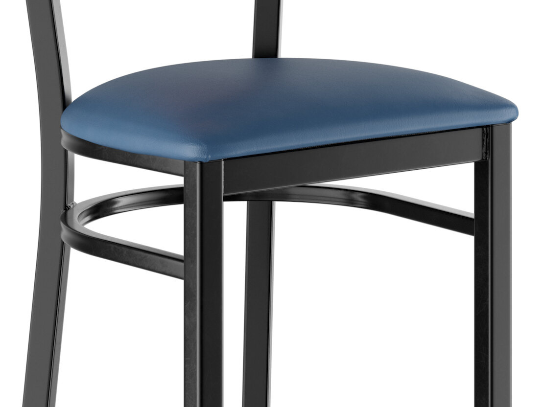 The 2 1/2" thick navy vinyl padded seat provides exceptional comfort for your guests, and it's also durable and easy to clean! It is made with fire-retardant foam for added safety.