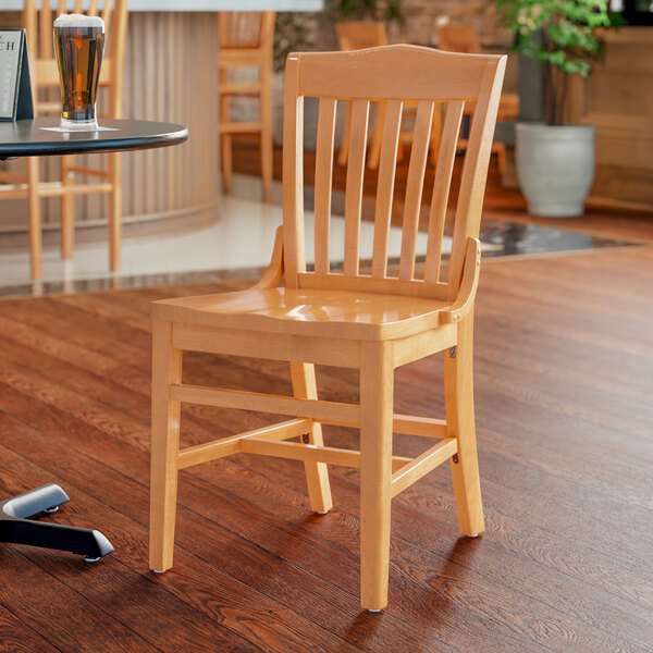 This chair boasts a vintage school house design with a wide frame and square silhouette. This style lends an old-school appeal to your dining room that's sure to invoke nostalgia and charm your patrons. This chair also features a slat back that's contoured to provide extra support to your customers' upper backs.